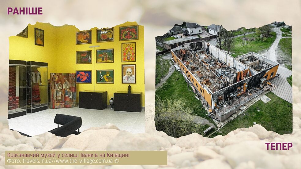 Після згадки Марії Примаченко буде доречно перейти до того, як від російської окупації постраждала її творча спадщина. Конкретніше мова піде про краєзнавчий музей у селищі Іванків на Київщині, в якому зокрема зберігалося 14 полотен художниці. Іванків опинився під окупацією в перші дні повномасштабного вторгнення, а вже невдовзі після цього в музей, у якому, крім робіт Примаченко, зберігалося ще приблизно чотири сотні експонатів, поцілила російська ракета, знищивши маєток 19 століття, в якому він був розташований. За злою іронією долі найбільше постраждав саме той зал, у якому зазвичай і виставлялись картини. Тому в ЗМІ швидко поширилось повідомлення про те, що картини вкупі з іншими експонатами були знищені. Однак цього разу, на щастя, чутки не справдилися. Охоронець музею самотужки витягнув картини з пожежі, спричиненої влучанням ракети, передавши їх згодом на переховування співробітникам музею. Тож для цієї спадщини Примаченко історія зрештою закінчилася добре. Але, на жаль, не для решти експонатів, серед яких і інші роботи художниці — розписані нею тарілки, що фактично були першими її кроками в образотворчому мистецтві.Пряме влучання ракети зруйнувало й літературно-меморіальний музей Григорія Сковороди в селі Сковородинівка на Харківщині. На щастя (якщо взагалі доречно вживати це слово в контексті таких подій), цей музей став жертвою росіян не в перші дні війни, як іванківський, а дещо пізніше, тож усі цінні експонати з нього встигли вивезти.