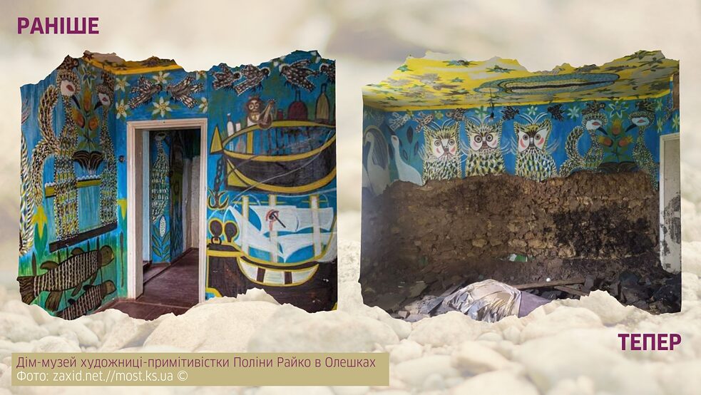 І оскільки ми почали зі згадки стихійних лих, варто згадати власне те останнє, яке спричинили росіяни, — повінь на Херсонщині, викликану підривом Каховської ГЕС. Крім надзвичайної екологічної катастрофи та тисяч зруйнованих життів, цей теракт, найімовірніше, знищив одну з найсамобутніших пам’яток українського мистецтва — дім-музей художниці-примітивістки Поліни Райко в Олешках, адже це місто було затоплене чи не найбільше (значна частина невисотної забудови була занурена в воду аж до дахів). Коли ми кажемо «дім-музей», то зазвичай ідеться про місце, в якому мешкав той чи інший митець, де (коли йдеться про художників чи скульпторів) була його майстерня і яке з часом було перетворене на музей. У випадку ж Поліни Райко сам її дім і був головним витвором її мистецтва: чи не весь його внутрішній простір — стіни, стеля, двері тощо — був оздоблений її роботами. Художниця фіксувала на тих поверхнях життя — своє і своєї родини — так, як бачила його і сприймала через призму власного світогляду. Її стиль часто порівнювали зі стилем іншої відомої української примітивістки, Марії Примаченко, однак укупі з формою творчий доробок Поліни Райко був достоту унікальним. Наразі Олешки тимчасово перебувають під російською окупацією, тому дізнатися достеменно, що збереглося після затоплення, зараз неможливо. Однак оскільки через непрості життєві обставини мисткиня мусила використовувати для роботи найдешевшу фарбу, шансів на порятунок цього унікального об’єкту, на жаль, небагато.