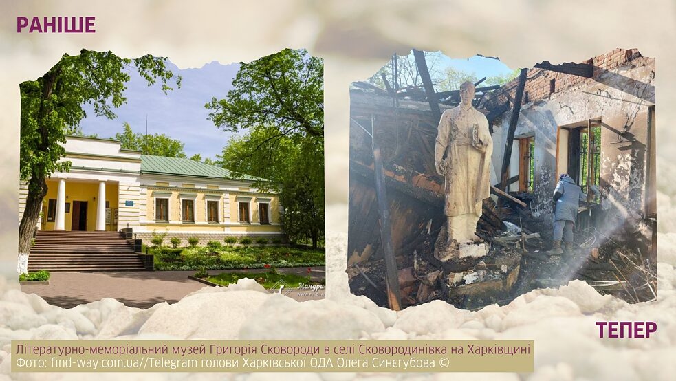 Це були як предмети, безпосередньо пов’язані з життям філософа, так і ті, що створювали для відвідувачів картину епохи, в якій він жив. Однак у випадку з меморіальними музеями нерідко буває так, що й саме місце їхнього розташування є частиною історії. Так сталося й тут: у колишньому маєтку, де був розташований музей, Сковорода провів останні роки життя і саме на його території був похований. І випадок саме з цим музеєм — чи не найбільш показовий у тому, як росія прагне нищити нашу культуру. Адже, на відміну від багатьох інших таких атак, які можна було би списати на випадковості чи на загальну окупаційну політику, тут вона ладна була витратити окремі час, збройні ресурси й гроші на те, щоби просто фізично стерти частину пам’яті про помітну українську культурну постать, яку їм так і не вдалося привласнити.