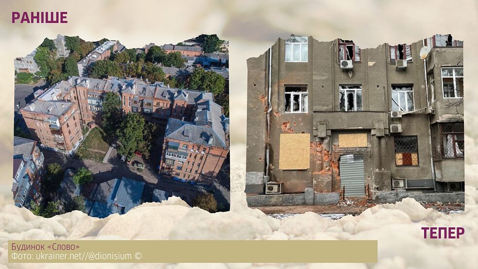 Цікаво, що інша літературно-історична архітектурна пам’ятка, яка постраждала від російських обстрілів, розташована не дуже далеко від попередньої — у Харкові. І йдеться, ясна річ, про знаний будинок «Слово» — місце, у якому в 1930-х роках мешкала ціла плеяда провідних українських письменників_ць і культурних діячів_ок. І місце, де значна частина з них закінчили своє вільне життя (а то й життя взагалі). І хоча снаряд прилетів не в сам будинок, а поруч, уламки завдали помітних ушкоджень, що тепер ніби ще більше про історичну (не)долю цієї будівлі. Направду складно знайти іншу таку будівлю в Україні, для якої бути розстріляною росіянами мало би настільки потужний символізм. (Варто окремо додати, що у випадку з будинком «Слово» загроза була незмірно більшою, ніж із більшістю інших культурних споруд, що постраждали, адже це — чи не єдиний повноцінно житловий будинок у їхньому переліку, тож тут під загрозою опинилося не лише минуле, а й теперішнє та майбутнє.)