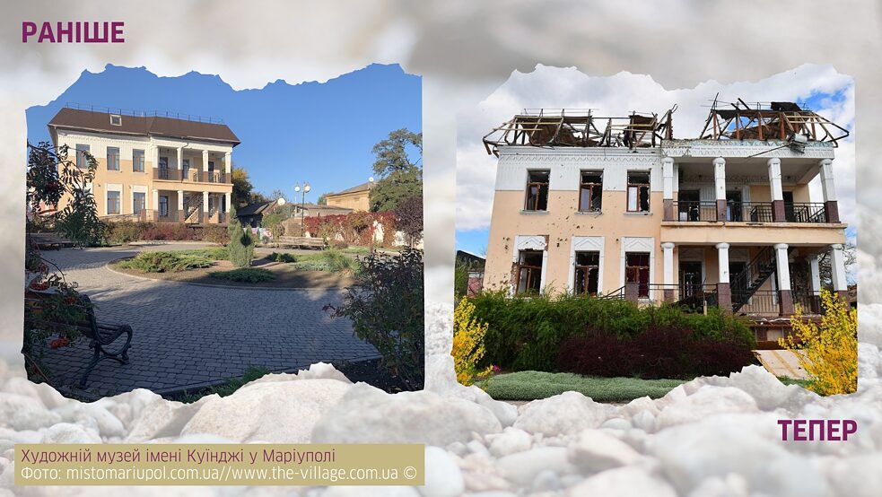 Усе ж не всі музеї знищувалися (і знищуються) фізично, хоча з ними стається те, що перетворює їх на змертвілу оболонку, примарну подобу самих себе. І стається це внаслідок масового вивезення їхніх колекцій — як це сталося з Херсонським художнім музеєм, із якого під виглядом «евакуації» незадовго до звільнення Херсона українською армією до тимчасово окупованого Криму було вивезено приблизно 11 тисяч експонатів із загального фонду в понад 13 тисяч. Серед іншого, там було чимало робіт саме українських художників і художниць: Шовкуненка, Пимоненка, Яблонської, Глущенка, Айвазовського тощо. І зважаючи на те, скільки вже свого мистецтва ми втратили зусиллями росії (хтозна, чи з можливістю бодай колись повернути), кожне прізвище із такого переліку болить окремо. А ще окремо дошкуляє (проте геть не дивує) той факт, що такими «евакуаціями» зазвичай керують люди, які знаються на мистецтві, тож надія, що це просто варварський стихійний грабунок, після якого можуть просто лишитися непоміченими цінні екземпляри, тане особливо інтенсивно. А заразом це доводить і нагадує: для росії такі крадіжки — свідома частина політики, спрямованої на позбавлення культурних надбань тих, ким вони прагнуть (марно) керувати.Маріуполь: системні руйнування
