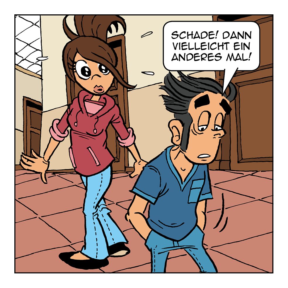 Ich sage, „Schade! Dann vielleicht an anderes Mal!“ und gehe.