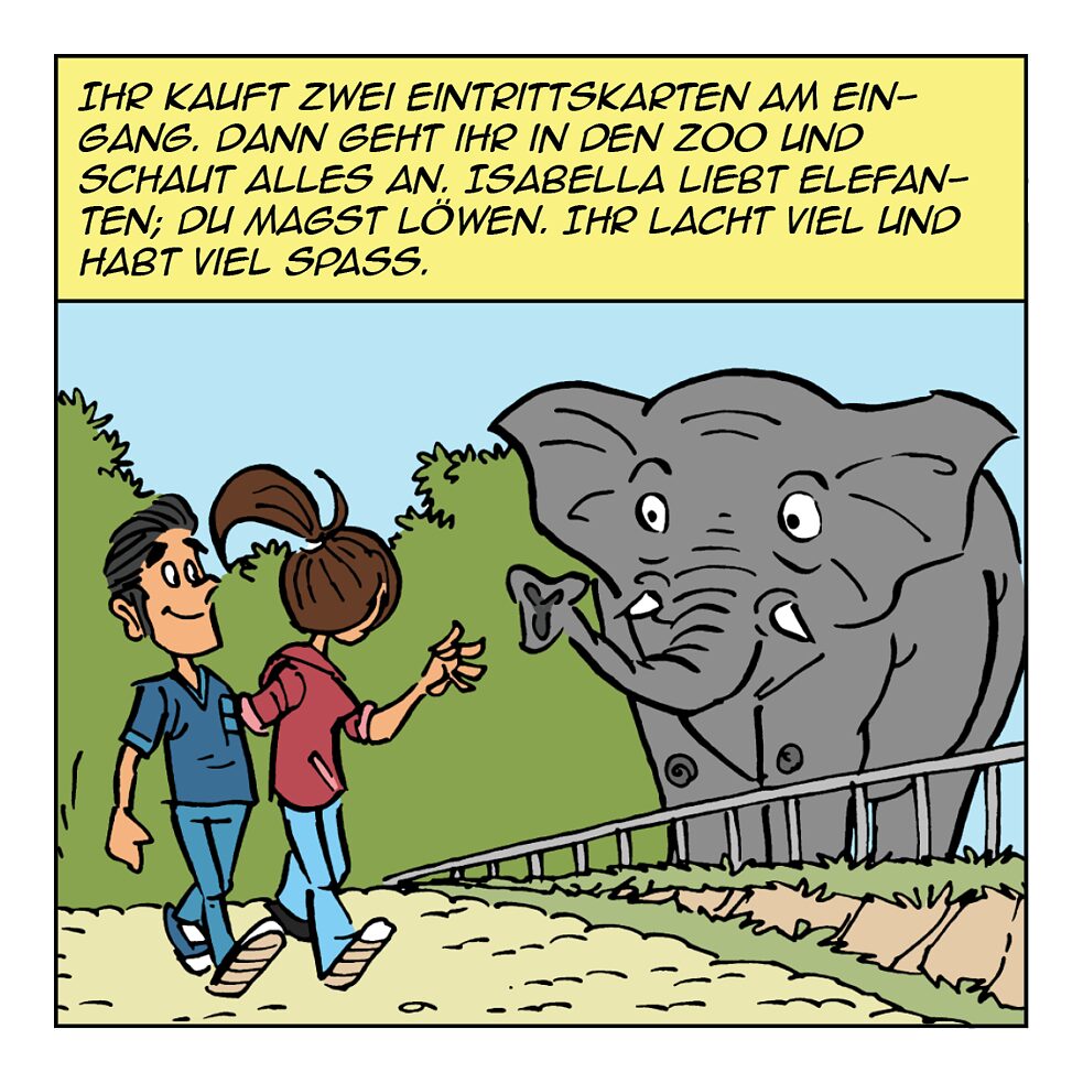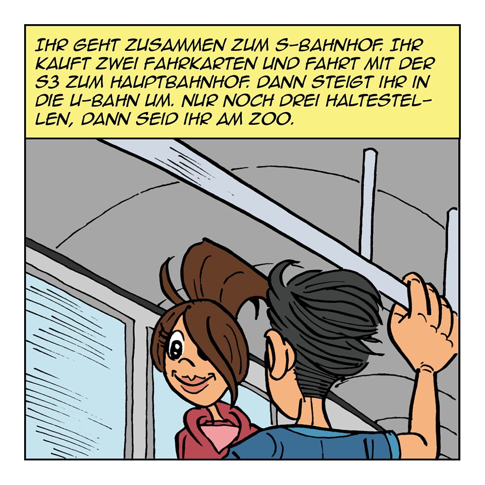 Super! © Goethe-Institut Ihr geht zusammen zum S-Bahnhof. © Goethe-Institut Ihr kauft zwei Eintrittskarten am Eingang. © Goethe-Institut Ihr steht bei der Krokodilanlage. © Goethe-Institut