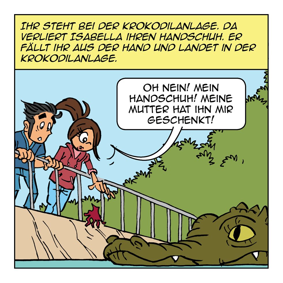 • Ich springe in die Krokodilanlage und hole Isabellas Handschuh.