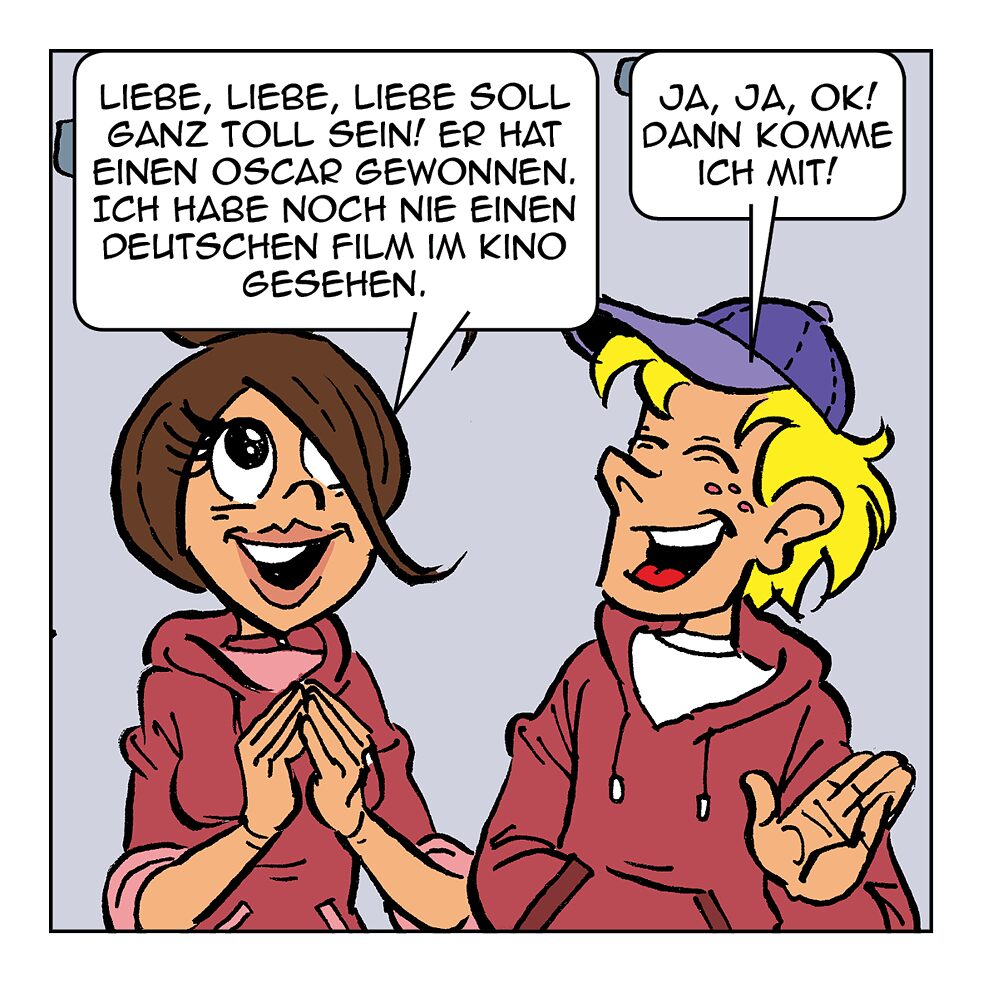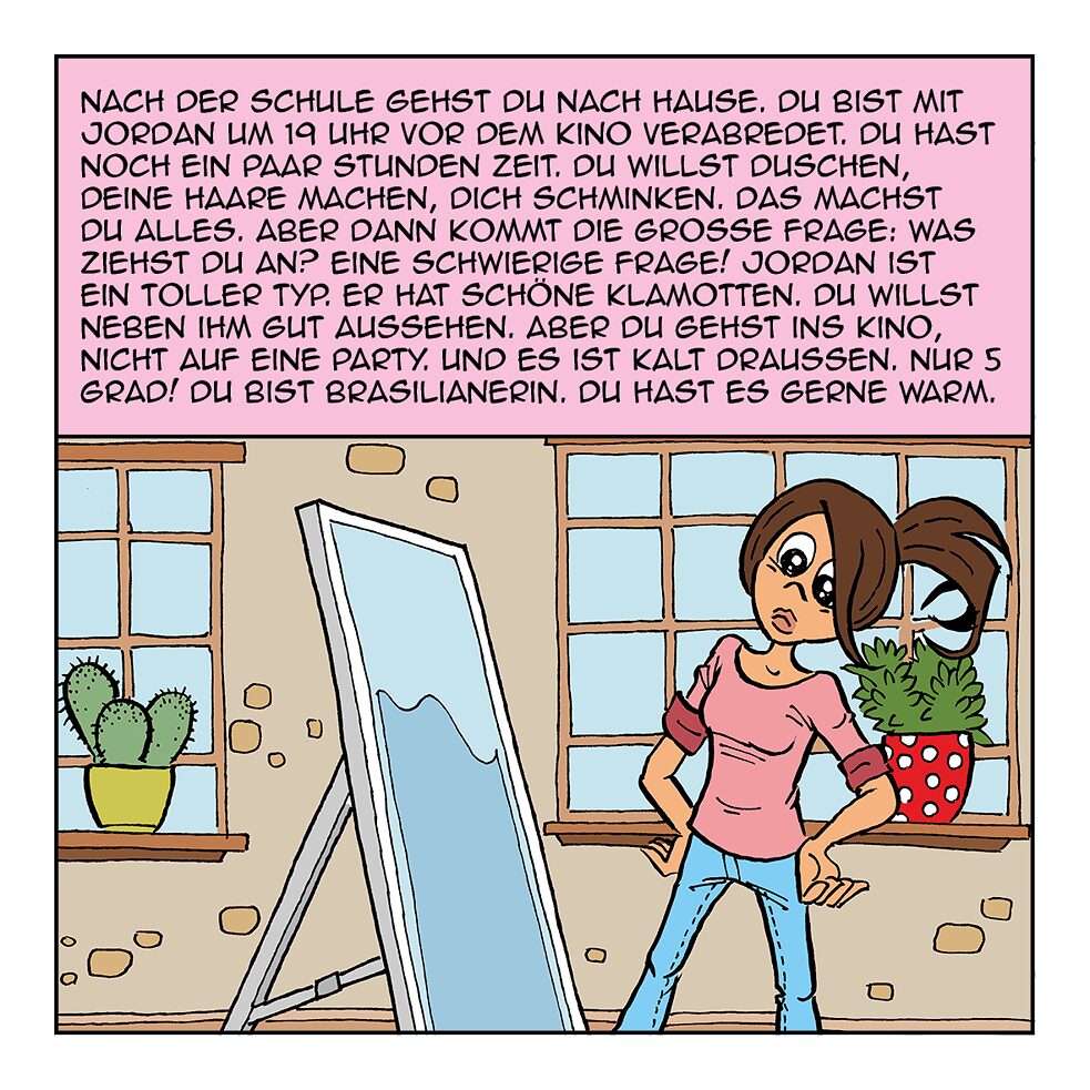 Ich ziehe Jeans und einen warmen Pullover an.