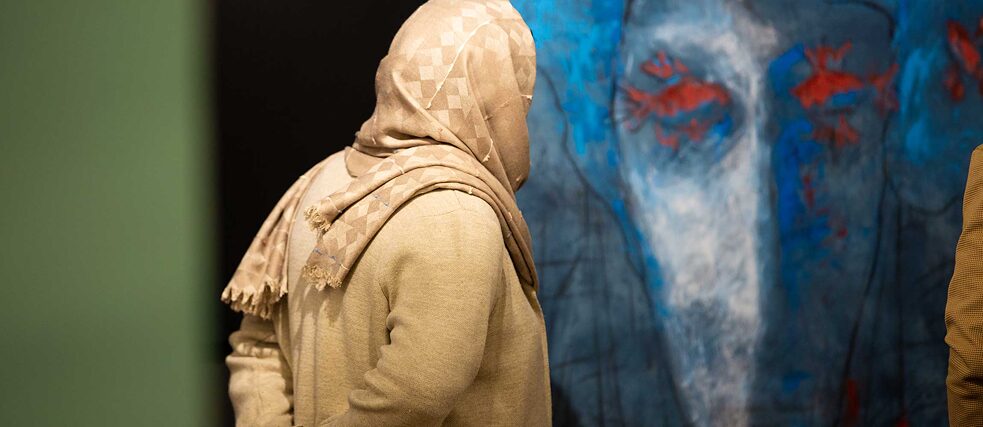 Der Künstler Awder Osman blick auf seine Gemälde im Rahmen des vom Goethe-Institut Irak initiierten Projekts „Helan“.