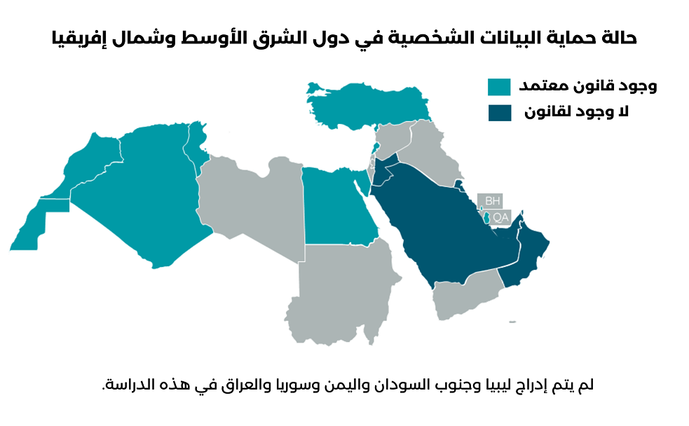 وفقًا لكولن أنترناشنل (Cullen International)، وهي شركة أبحاث في القضايا التنظيمية ، فإن "جميع البلدان التي تمت دراستها في منطقة الشرق الأوسط وشمال إفريقيا ، باستثناء الكويت والأردن، لديها تشريعات وطنية لحماية البيانات الشخصية. كانت تونس أول دولة تصدر قانونًا وطنيًا لحماية البيانات في منطقة الشرق الأوسط وشمال إفريقيا في عام 2004، تليها المغرب في عام 2009، بينما اعتمدت قطر وتركيا قانونيهما في عام 2016. سنت البحرين والجزائر ولبنان قوانينها الوطنية لحماية البيانات في عام 2018 ومصر في عام 2020. أصدرت الإمارات العربية المتحدة قانونًا اتحاديًا لحماية البيانات الشخصية في نوفمبر 2021، والمملكة العربية السعودية في أكتوبر 2021. في عُمان، تم تمرير قانون حماية البيانات مؤخرًا. ومع ذلك، لن يدخل حيز التنفيذ إلا في 13 فبراير 2023، بعد عام واحد من نشره.»