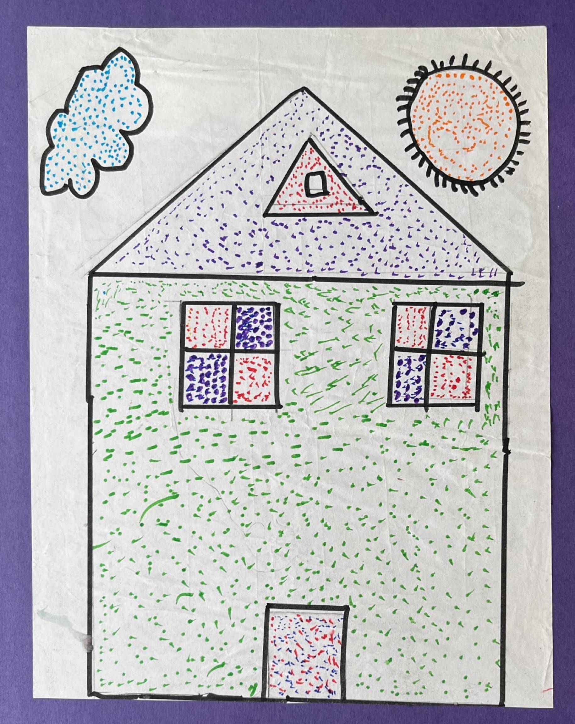 This is the home of my dreams. I saw it in the VIP area of Delhi when I was going somewhere with my father. It is a very beautiful house, and it is strong. My home in Khirkee is not strong, it will break in an earthquake. And when it rains, the street outside is full of mud. It is very difficult to walk there. That's why I drew this house.