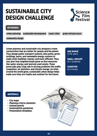 In diesem Abschnitt finden Betreuer, Lehrer und Eltern Aktivitäten, die an die Filme des jährlichen Wissenschaftsfilmfestivals für Kinder im Vorschul-, Grundschul- und Sekundarschulalter anknüpfen. Dazu gehören Lernspiele, Projekte und praktische Experimente, die vor oder nach dem Besuch des Festivals durchgeführt werden können, um die Erfahrung zu bereichern.