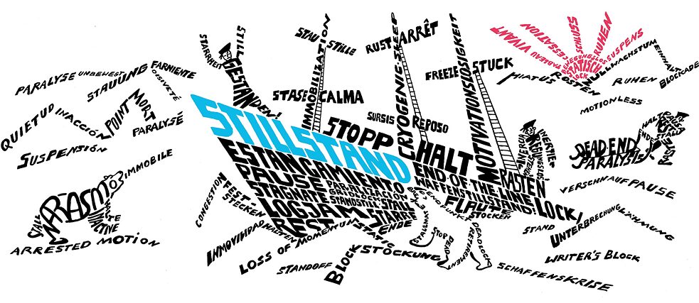 Gemeinsam mit unserer Illustratorin Kitty Kahane haben wir den Stillstand unter die Lupe genommen und die aus unserer (subjektiven) Sicht häufigsten Begriffe rund um diesen Zustand gesammelt. Hier kommt das kreative Ergebnis in den Sprachen Deutsch, Englisch, Französisch und Spanisch.