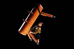 Unter lautem Knarzen wird eine Kette vom dunkelblauen Zeltdach des LATIBUL herabgelassen, dem Theater- und Zirkuspädagogischen Zentrum in Köln. Mit einem Karabiner befestigt Tänzerin Mijin Kim daran ein Pauschenpferd, 100 Kilogramm schwer, mit hellbraunem Korpus und vier Beinen, die sich steif nach außen recken. Als das Turngerät an der Kette nach oben gezogen wird, beginnt ein Spiel an der Grenze zwischen Zeitgenössischem Zirkus und Tanz, in dem andere Gesetze gelten. Mithilfe von Gravitation, Körperkraft und tänzerischer Genauigkeit hebt die Kompanie Overhead Project in Circular Vertigo unsere Raum- und Zeitwahrnehmung aus den Angeln. Alles dreht sich um die Beziehung zwischen Mensch, Objekt und Raum.