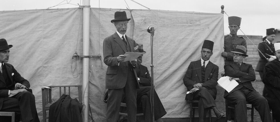 Eröffnung des Palestine Broadcasting Service am 30. März 1936. Generalgouverneur Arthur Grenfell Wauchope hält die Eröffnungsrede in Ramallah.