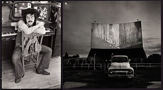 Links: Terry Allen (Foto von Gary Krueger, Courtesy Paradise of Bachelors). Rechts: das Chalk Hill Drive-in Theater am Highway 80 in Dallas, Texas (Silbergelatineabzug von Steve Fitch von 1973, Courtesy Smithsonian American Art Museum)